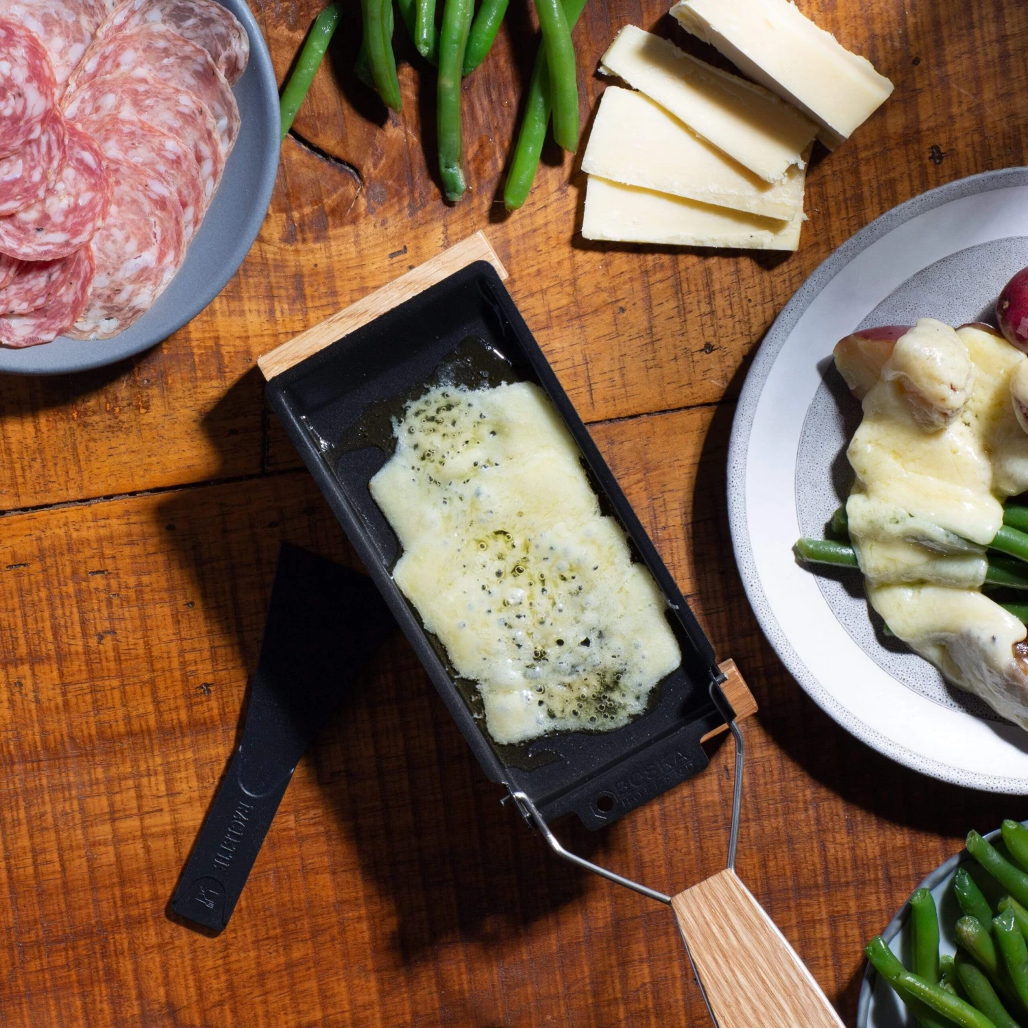 Materials: Stainless steel, wood, plastic, steel[/accordion] Care and Use [/title]Care: Dishwasher not recommended[/accordions-break]The phenomenon of raclette has actually been a dining experience since 1921.[/banner_heading]Otherwise known as an outdoor meal of vegetables and raclette cheese warmed by a campfire, farmers from Valais in Western Switzerland, were the first to eat it. Traditionally, a wheel of raclette cheese was cut in half and placed near the fire until it began to melt and was scraped onto veggies such as boiled potatoes, pickled onions, gherkins, capers, and more.[/banner-text-break]Light tea lights, add your cheese to the pan, set the pan on top of the lit base and allow cheese to heat. You’ll have melted cheese in minutes. In the absence of raclette cheese, Gruyère, Emmental, Fontina or any mixture of these good melting cheese will work well.[/how-to-use-break]Dishwasher not recommended.