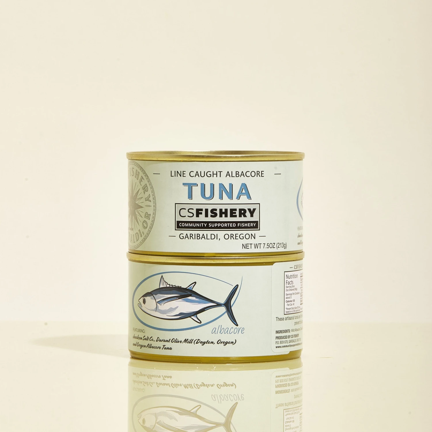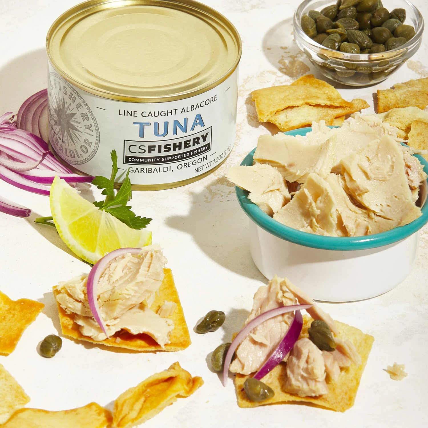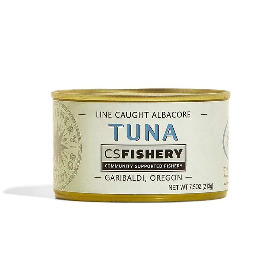 [/description-break] Ingredients [/title]Ingredients: Line caught Oregon Albacore Tuna, Oregon Olive Mill Olive Oil and Jacobsen Sea Salt[/accordion] Specifications [/title]Net Weight: 7.75 ouncesPlace of Origin: Oregon, US[/accordions-break]In 2013, CS Fishery was founded by longtime fisherman Jeff Wong, who saw problems with the current system of selling seafood. [/banner_heading]Small-operation fishermen bringing in a premium catch were losing out through the distribution process going through commercial fish buyers, so Wong began using his own 24-foot dory boat to connect and buy direct from local fishermen to promote sustainable fishing and fair wages. Now, CS Fishery’s fleet is made from a handful of small and medium-sized boats that take short trips—meaning that their fresh catch will make it back to shore the same day. [/banner-text-break] The tuna is delicious flaked onto a Nicoise salad or folded into a tuna salad with mayonnaise, herbs and a few chopped sweet-sharp Peppadew peppers. For a Spanish twist, we like to flake the tuna into a batch of deviled eggs, adding a few chopped olives, pickled peppers and minced fresh basil or thyme. An Italian classic is tuna mayonnaise, or tonnato, which is perhaps a ripe tomato’s best partner. Joshua McFadden—the chef of Ava Gene’s in Portland, Oregon—lays down a thick schmear of tonnato beneath a simple, lightly dressed green salad; he also inspired our Sugar Snap and Radish Salad with Olive-Oil Tuna. We also love CS Fishery’s tuna with pasta: Combine it with capers, herbs, garlic and fruity olive oil in a quick pantry pasta sauce. Or make a simple pasta topping by warming flaked tuna with sautéed garlic, chili flakes and scallions; toss with fruity extra-virgin olive oil, arugula, capers and toasted breadcrumbs (skip the cheese on this one). [/how-to-use-break]
