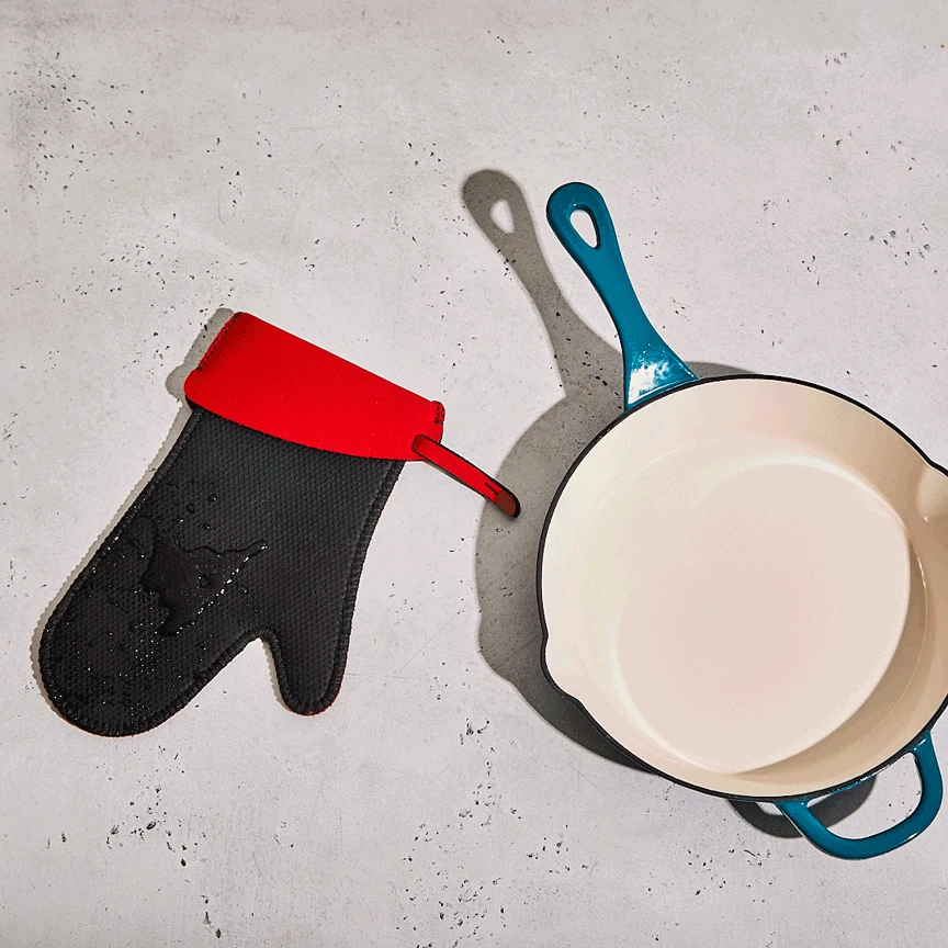 Handling hot kitchen equipment or serving dishes has never been safer than with this heat-resistant, stain-resistant, water-repellent oven mitt. This dishwasher-safe mitt has a nonslip grip from the raised nub surface pattern, which allows for more insulation between your hand and a hot surface. The result is a better and safer grasp, even as the mitt remains soft and flexible. Made from FLXaPrene™ material and Kevlar® stitching, the surface rejects bacteria buildup and is easy to clean in the dishwasher. Plus it is water repellent to protect hands from steam and liquid burns. This functional mitt offers high-quality workmanship that has been subjected to rigorous testing standards—no detail is overlooked. Available in small and large, sold one to a set.