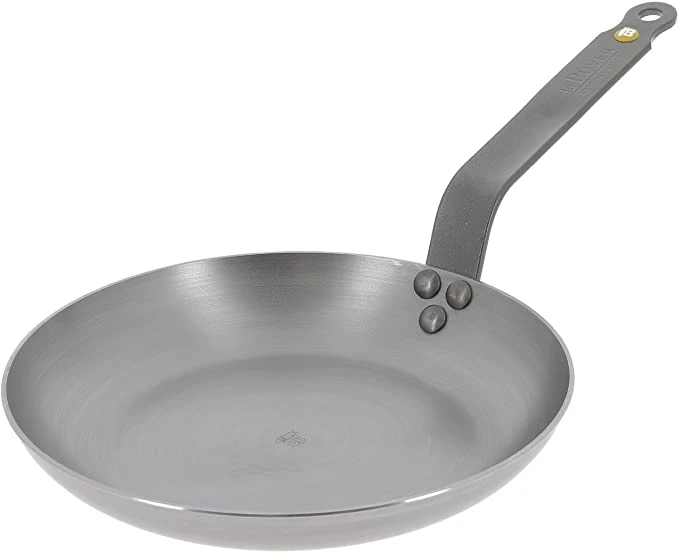 Before you use your de Buyer carbon-steel pan for the first time, clean it with very hot water and rub down the entire surface to remove excess beeswax. Heat oil in your carbon-steel dish on the stovetop—enough to cover the bottom—until it starts to smoke, then discard the oil and rub the cookware down with paper towels. Before the cookware develops a fully blackened patina, we recommend adding a little more oil or butter to start, and ensure the pan is fully preheated and evenly coated in fat before adding ingredients.