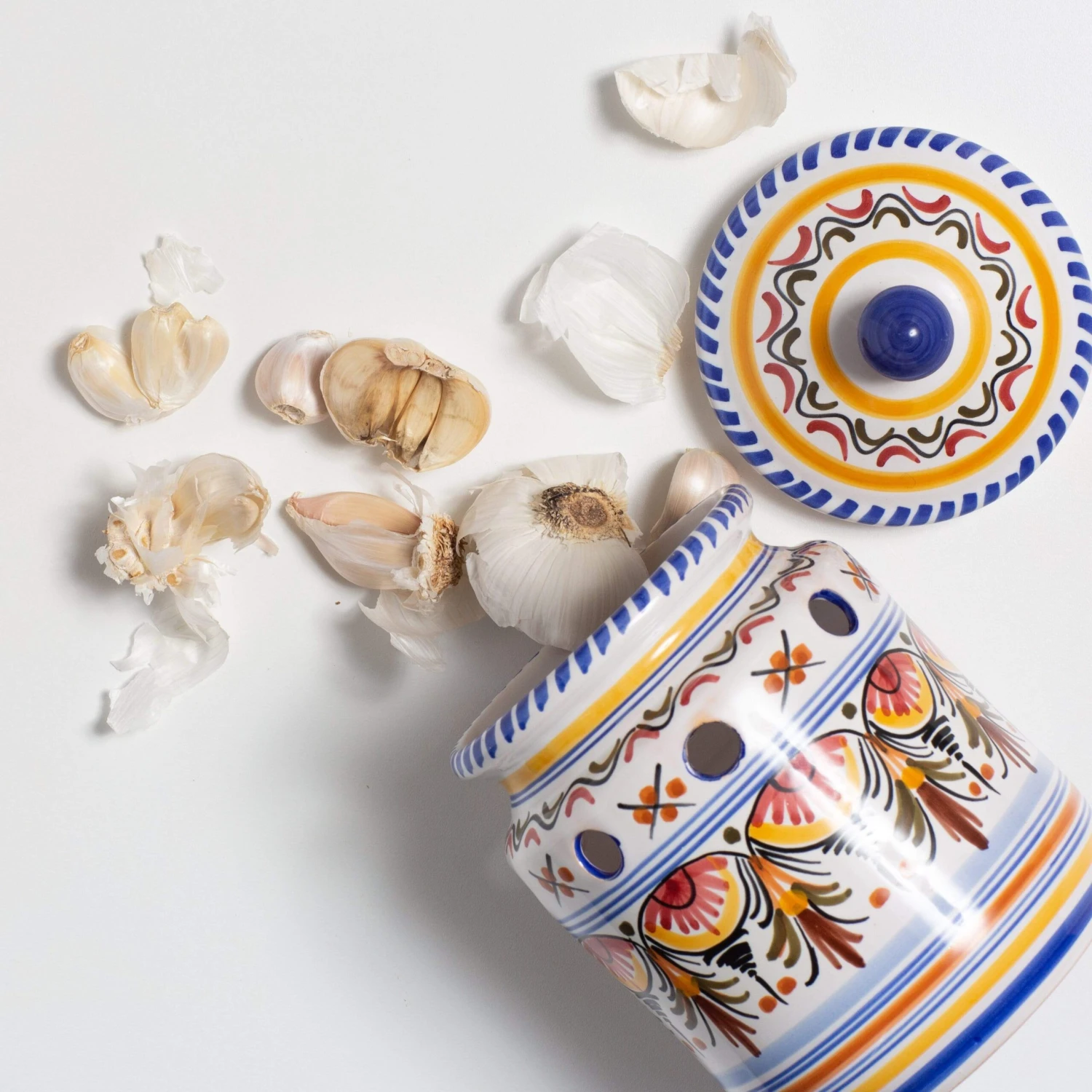 This stunning garlic keeper is a lively addition to any kitchen counter. It’s hand shaped and hand painted and features perfectly-sized holes that allow air flow so the garlic stays fresher longer.