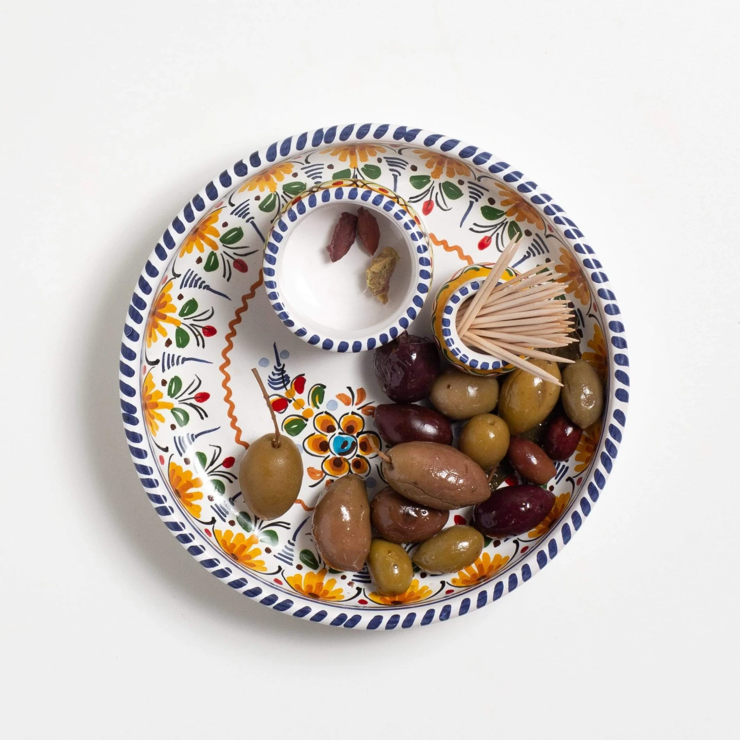 Hand-shaped on a potterโs wheel, this hand-painted olive tray features a thoughtful design with three compartments: one for olives, one for pits and one for toothpicks to spear the olives (both smaller bowls are fixed to the tray). Itโs the traditional style of olive dish found throughout Spain and is equal parts beautiful as it is functional.