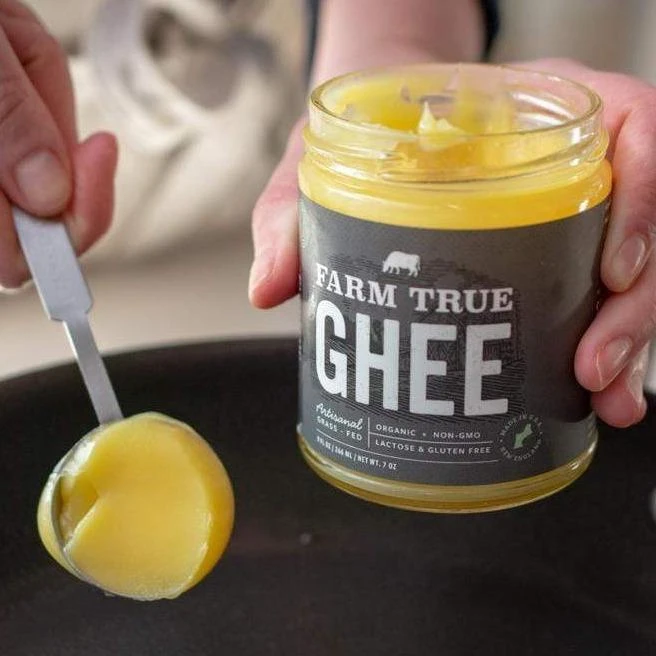 [/description-break] Specifications [/title] Net Weight: 9 ounces [/accordions-break] Essential in traditional Indian cooking, ghee (butter simmered long enough to cook off the water and milk solids) has become a core pantry staple for all of us at Milk Street. [/banner_heading] It has a addictively bold, buttery flavor and a high smoke point (485°F), making it as ideal for sautéing and searing as flavoring vegetables, legumes, grains, pasta and even toast. We’ve tasted and tested a broad range of ghee brands and are pleased to find the best produced in our own backyard. Farmtrue ghee is made in New England with organic cream from grass-fed cows. [/banner-text-break]With its higher smoke point, ghee can be used for sauteing meats, fish and vegetables. We love its buttery flavor in curries and rice pilafs, as well as simple creamy lentil soups or used to roast potatoes. [/how-to-use-break]FarmTrue Ghee