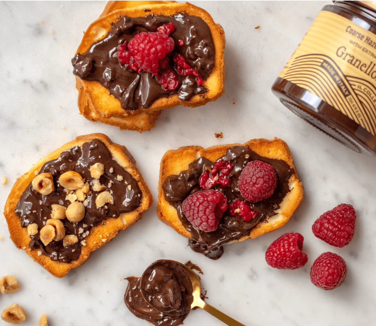 [/description-break] Ingredients [/title] Ingredients: Hazelnuts, sugar, extra-virgin olive oil, rice flour, cocoa, vanilla, sunflower lecithin (as emulsifier) Allergens: Gluten- and dairy-free [/accordion] Specifications [/title] Net Weight: 250 grams Place of Origin: Italy [/accordion] CARE AND USE [/title] N/A [/accordions-break] Organic extra-virgin olive oil from the Sabine Hills northeast of Rome lends a lustrous, glossy sheen and has a cleaner taste than the heavy palm oil that other brands use; it also gives the dessert pastes a luscious consistency that is far superior to cloying Nutella. [/banner_heading] They don’t taste noticeably of olive oil, either; rather, the fruity notes enhance those same qualities in the chocolate, and the spread is rounded out with floral-scented vanilla. Choose between smooth Noccioliva or crunchy Granellona Brut, which has chopped hazelnut pieces but is still silky and spreadable. [/banner-text-break] Use these chocolate and hazelnut spreads as a wonderful addition to most any dessert. The olive oil in Il Colle Del Gusto’s product makes it especially easy to incorporate into pastry cream, ice cream or any custard base. We also swirl it into cheesecakes, brownies and quick breads. Or whisk together with an equal amount of hot cream for fondue and serve with sliced pears, strawberries and crunchy cookies. We also love this aromatic flavor combination for breakfast. Spread it on a crepe as the French do, or slather on toast, pancakes or waffles and top with fresh sliced fruit. Blend with Greek yogurt, bananas, ice and your milk of choice for easy breakfast smoothies. Or swirl some into your breakfast oatmeal, especially nutty steel-cut oats. [/how-to-use-break] We’ve even used the hazelnut spread for making indoor S’mores, gently toasting the marshmallows on fondue forks over a burner.Il Colle Del Gusto Granellona Crunchy Chocolate Hazelnut Spread