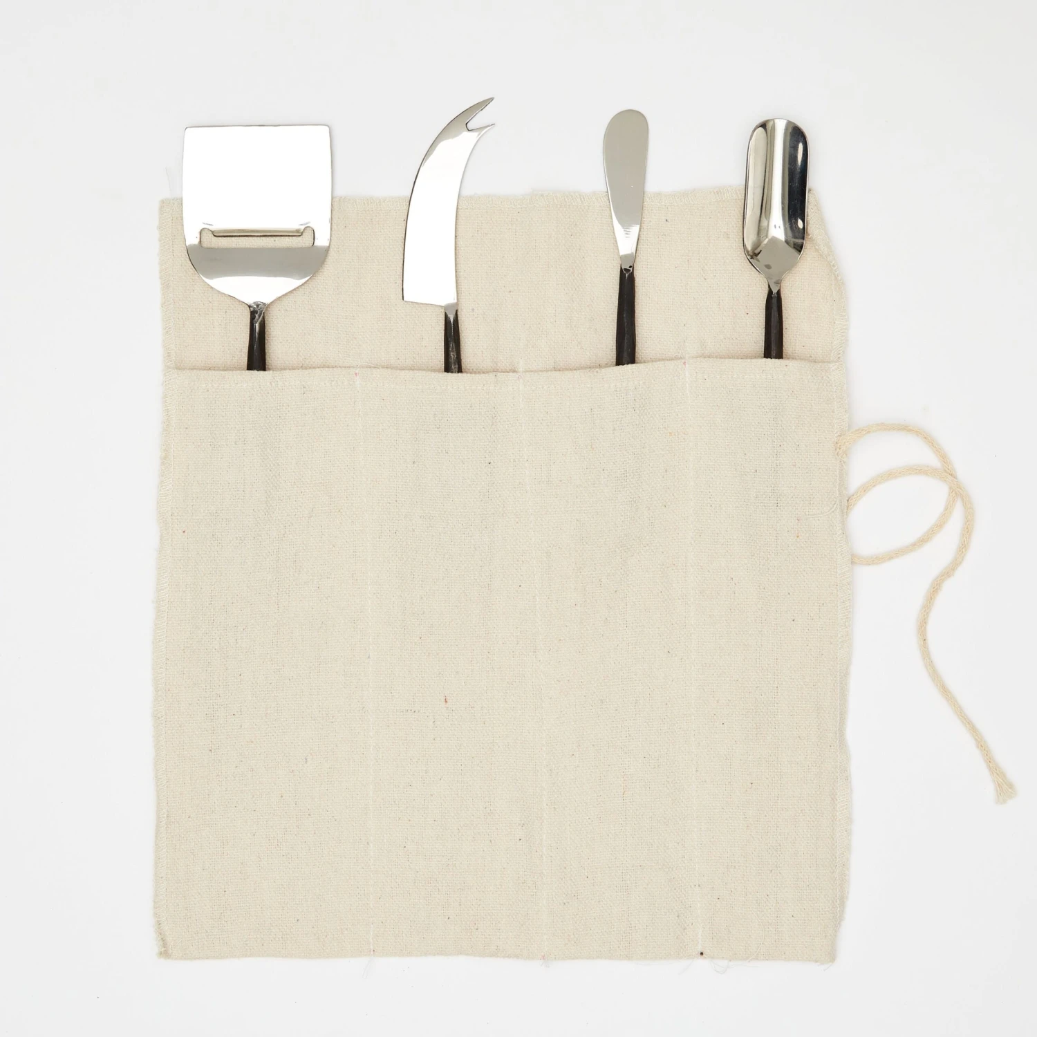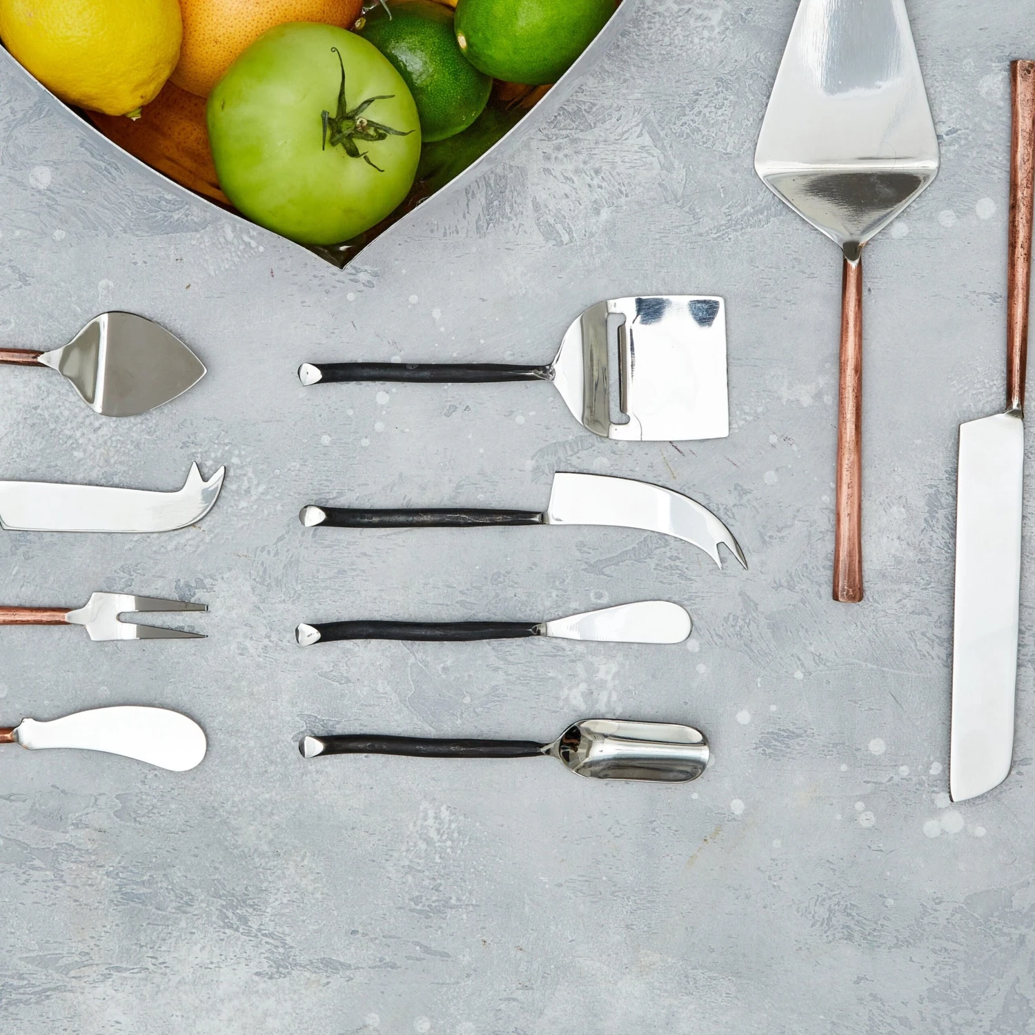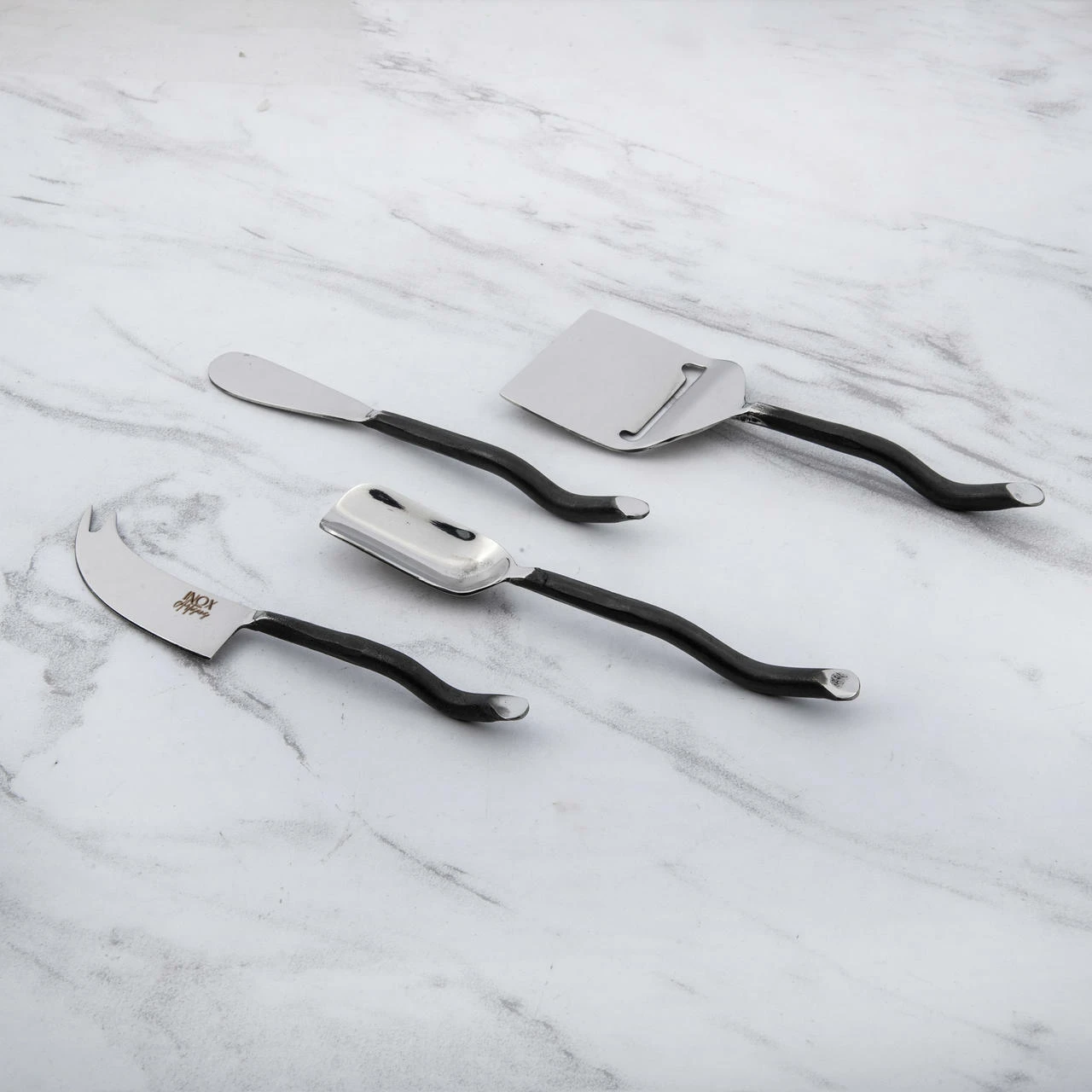 This set of four cheese knives from INOX Artisans are equal parts striking and functional, made with heavy gauge stainless steel. Hand-forged with traditional blacksmithing techniques and blackened to look like twigs, this set of 4 cheese tools—a cheese knife, spreader, plane and shaver—balance luxury finish with comfortable use. The tools’ handles lie flat, so they won’t roll around on a cheese plate or board, while the heads are carefully shaped (or include large cut-outs, in the case of the shaver) to prevent cheese from sticking. Note that pitting is natural during the forging process; it adds to the cheese set’s beauty and organic look and feel.