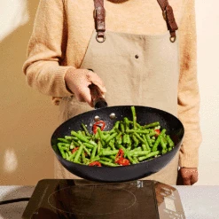 Unlike other pans with chemical coatings, the pan’s glossy black interior undergoes a special nitriding process, which produces an iron nitride layer that increases durability and prevents rust. The inside is then polished to a shine and given a hammered fish-scale finish to promote air flow under food, both of which ensure incredible nonstick properties straight out of the box with a quick initial seasoning. This sauté pan provides even and intense heat across the entire flat cooking surface. Plus, it works with any cooktop (gas, electric, ceramic and induction) and the accompanying lid, plus its stay-cool handle, is ideal for steaming as well.