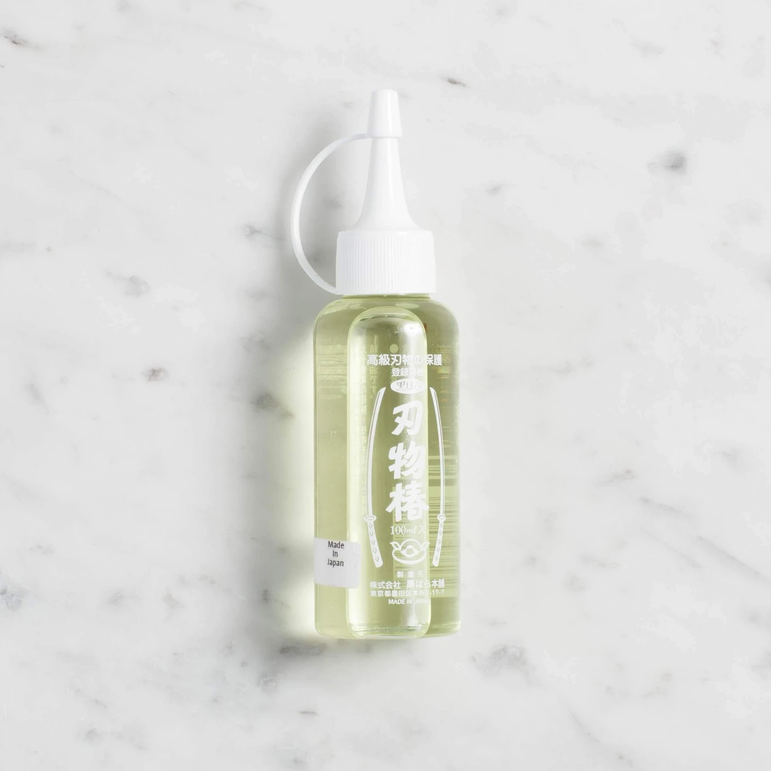 Camellia oil, also known as Tsubaki oil, is a lightweight, food-safe oil traditionally used to protect the surface of carbon-steel knives and swords, which are otherwise susceptible to oxidation and potential rust. It doesn’t turn gummy, nor will it turn rancid and effect the flavor of foods you prep. To use, apply a small dab on each side of the blade once a week and wipe dry with a paper towel.