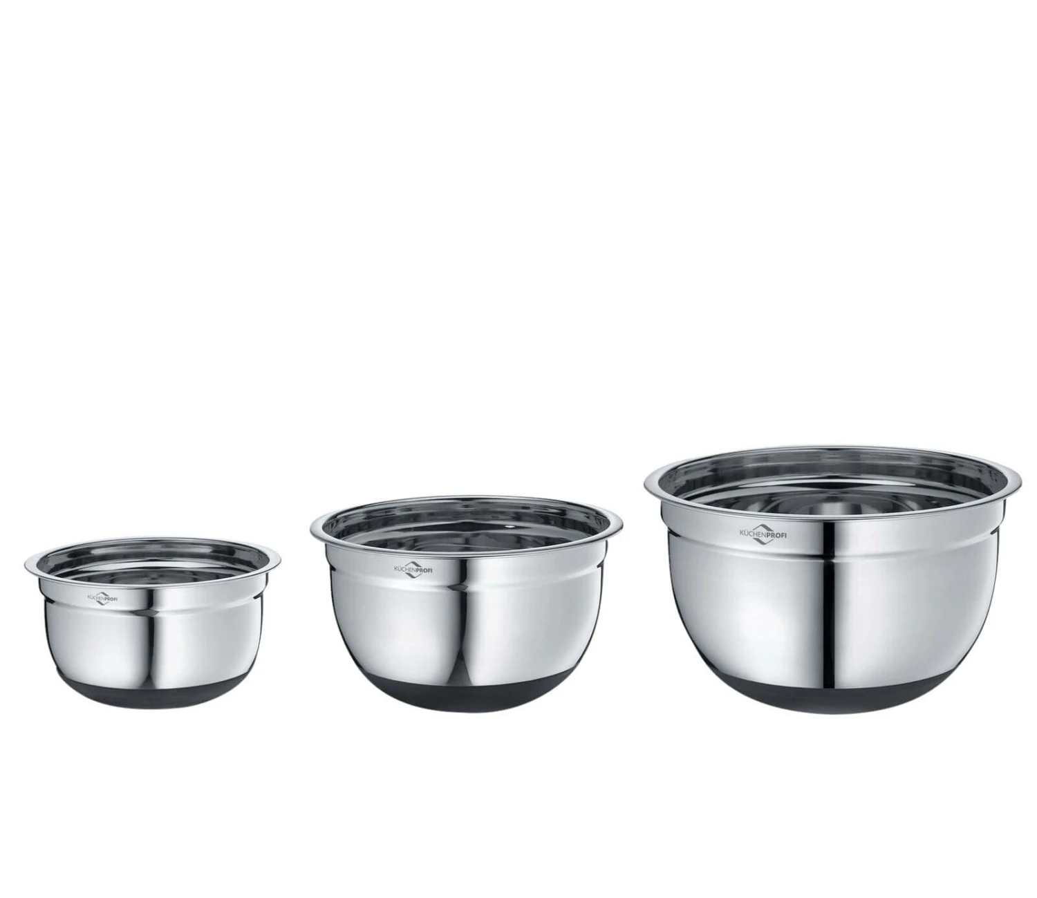 This three-piece set of heavy-gauge stainless steel mixing bowls has a more durable construction than others. Each bowl has a black silicone lining on its bottom, which prevents the bowls from shifting and slipping during prep work. They are fairly tall-sided, rather than widening further from the base toward the rim; this means less food spilling out and a generous capacity to prepare large batches of food at a time. We also appreciate how the non-slip linings are tightly adhered to the bowls; on poorly made models, this rubberized base may detach and fall off over time.