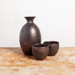 This stunning sake set is done in the Kyo-yaki style distinctive of Kyoto, Japan. It’s lovely for either hot or cold sake and features an elongated carafe that’s tapered at the top and is made from earthenware and finished with a brassy sheen. Available with a set of two cups.