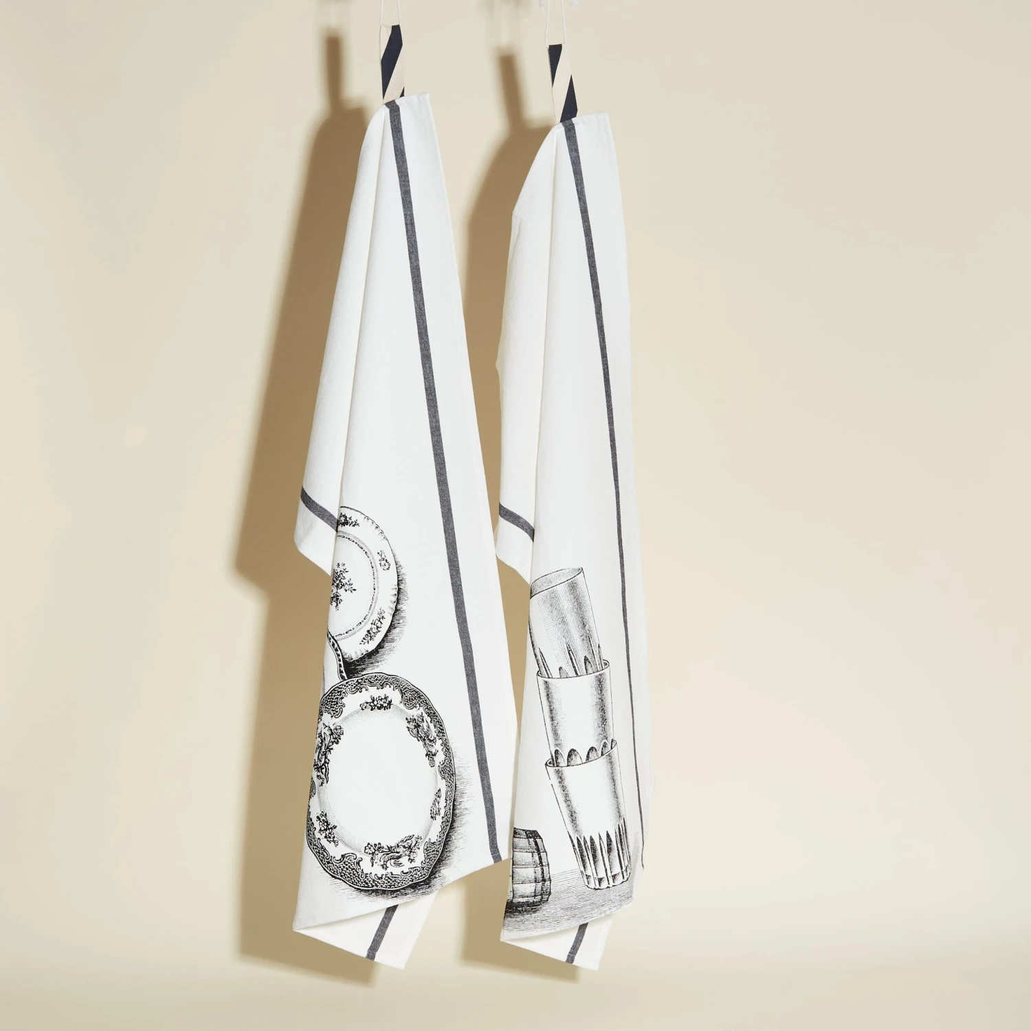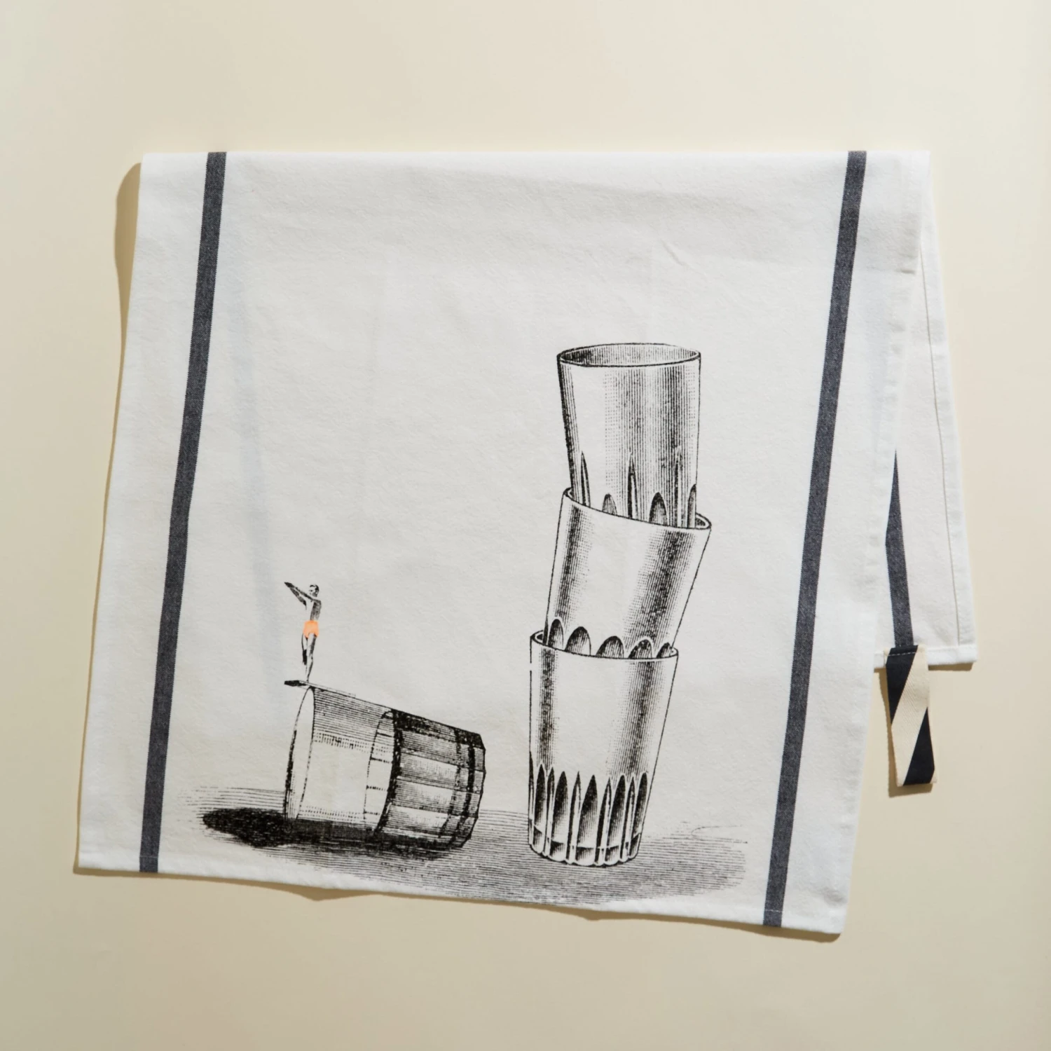 We found these charming tea towels in Paris. Made of 100 percent cotton in Portugal by family-owned workshops, they’re extra absorbent. Each towel comes with a little hook for easy hanging and a playful, durable silk-screen print. Sold individually in two different designs. Victor: Printed with a tiny swimmer, taking the plunge off of a stack of black and white glasses. Arlette: Printed with black and white images of transferware, a classic type of French crockery.