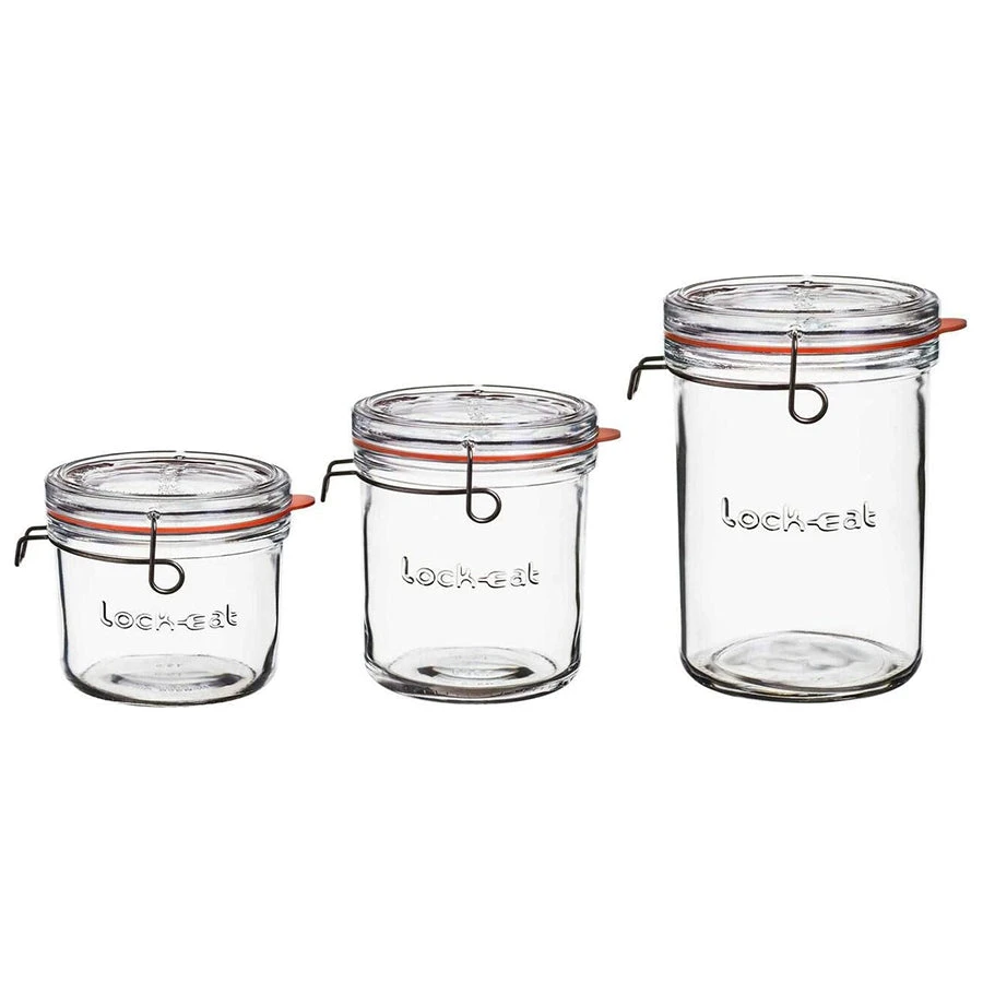 Sold in a set of 3, these jars from Luigi Bormioliโs Lock-Eat collection are functionally designed for canning and preserving. Made of sturdy glass, they work whether youโre using a heat treatment (boiling or potting) or pickling in oil, brine or a dry cure. Hermetically seal the contents of each Lock-Eat jar by deploying the glass lid, food-safe rubber gasket and stainless steel clamp, which together create an air-tight seal. Even though the jars are designed for storage and food preservation, theyโre attractive enough to use at the table, bar or on your countertops. For serving (and for easier cleaning), simply remove the lid, and you have an attractive piece that transitions easily to the table.