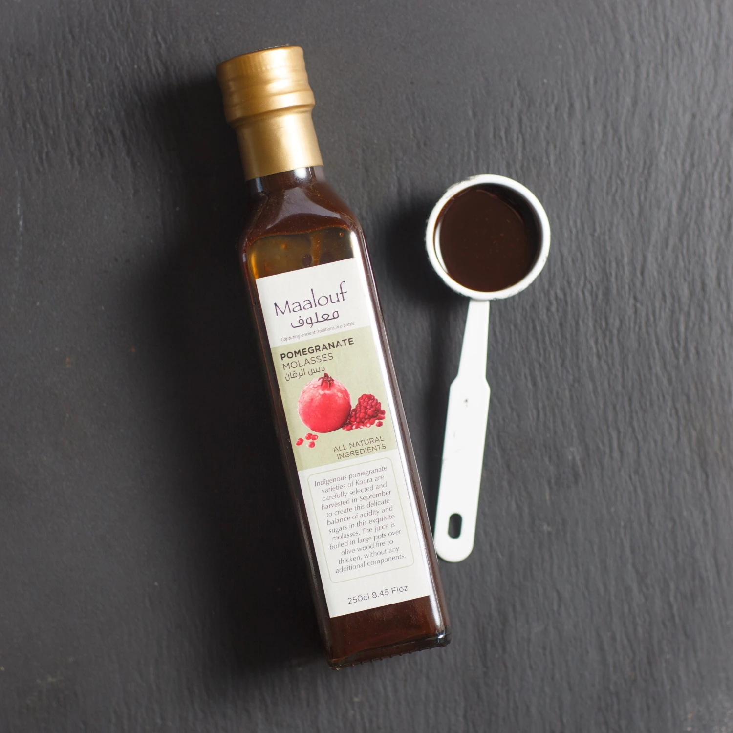 Place of Origin: Lebanon[/accordions-break] Next to his olive groves, Chafic Maalouf planted 630 pomegranate trees across two acres.โ [/banner_heading] The soilโs mixture of clay and silt, very rich in potassium, calcium and other minerals all contribute to the fruitโs depth of flavor. Capturing the perfect balance of sugars and acidity in the fruit for harvest is a tricky game, requiring a trained person to visit the orchard every morning in September, choose a few pomegranates and taste them to determine if they are ready for picking.[/banner-text-break] Use Maalouf pomegranate molasses when you want to balance out the savory or sweet notes of a dishโmuch like you might add lemon juice to a dish, but when you also want to provide a background sweet note and complexity. We love it stirred into vinaigrettes like for our Seared Scallop and Arugula Salad with Pomegranate Vinaigrette, added to boost the savory flavor of lamb or beef like in our Rib-Eye Steaks with Rosemary and Pomegranate Molasses, or drizzled over Middle Eastern dips like our Muhammara. [/how-to-use-break] ย