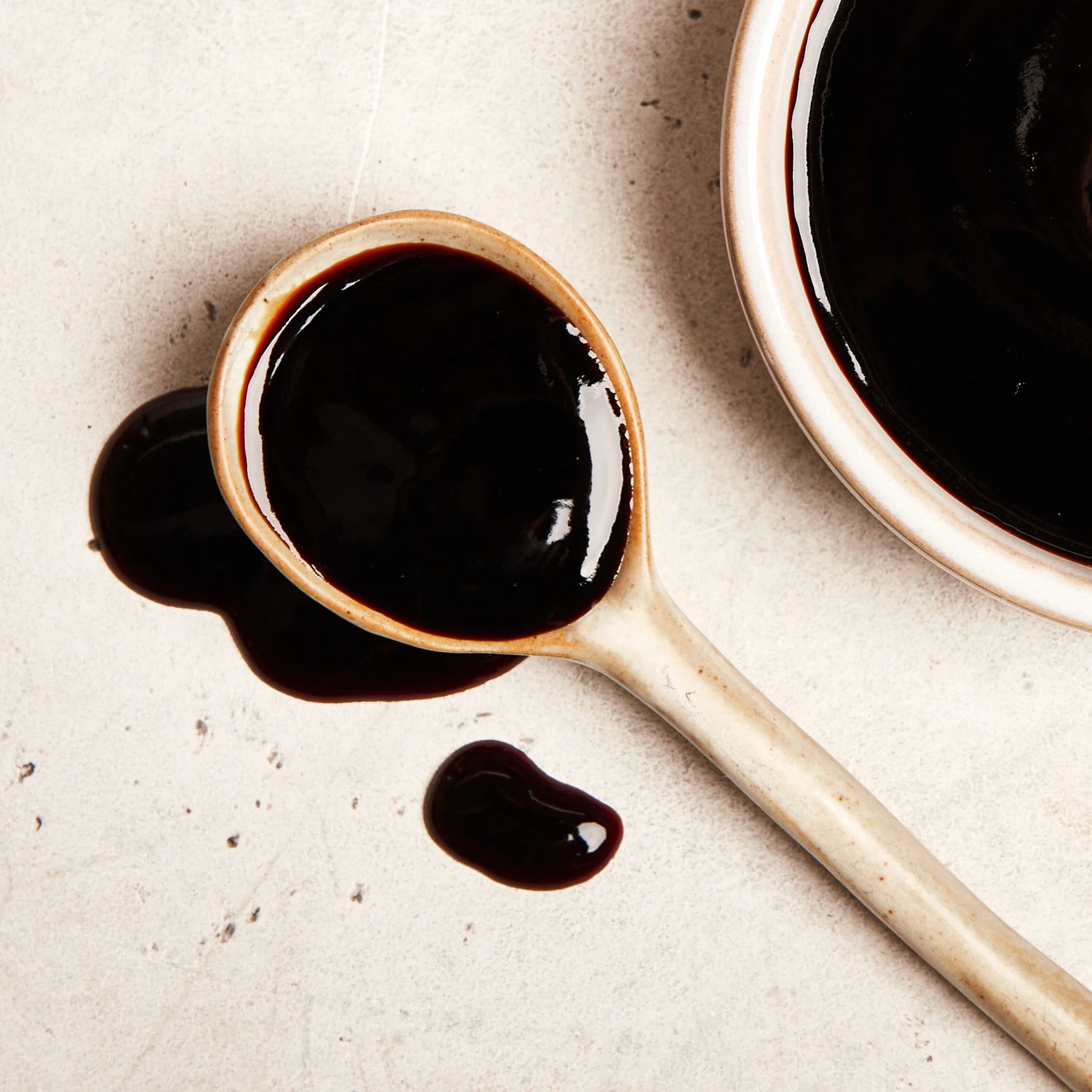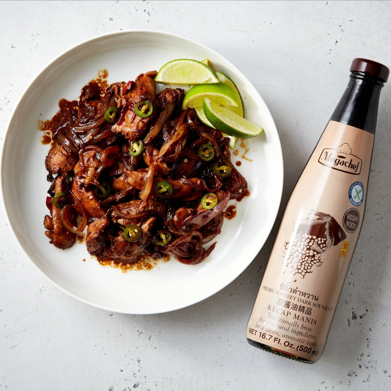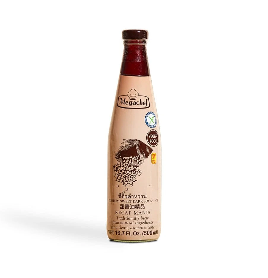 After years of searching for the right one, we finally found a version of this Indonesian staple condiment we are proud to sell. Kecap manis, or “sweet dark soy sauce,” is an Indonesian secret for depth, umami and complexity. Megachef’s version—the best one we’ve tried—is virtually impossible to find in the United States. Of the handful of brands sold here, most are packed with thickeners, additives and flavorings; apart from a nominal amount of starch for consistency, Megachef adds no preservatives, artificial coloring or MSG, and its flavor is significantly bolder and richer than the other versions we’ve tried. Soy sauce from non-GMO soybeans and high-quality palm sugar are simmered until the sauce becomes thick and glossy, with a deep dark color and consistency similar to hoisin. The resulting sauce isn’t as salty as soy or as sweet as hoisin, the two most comparable condiments—but it has a funky malty, umami soy flavor, almost akin to molasses. Use it for Indonesian or Asian cooking or anywhere you might like a funky, barbecue sauce-like glaze.
