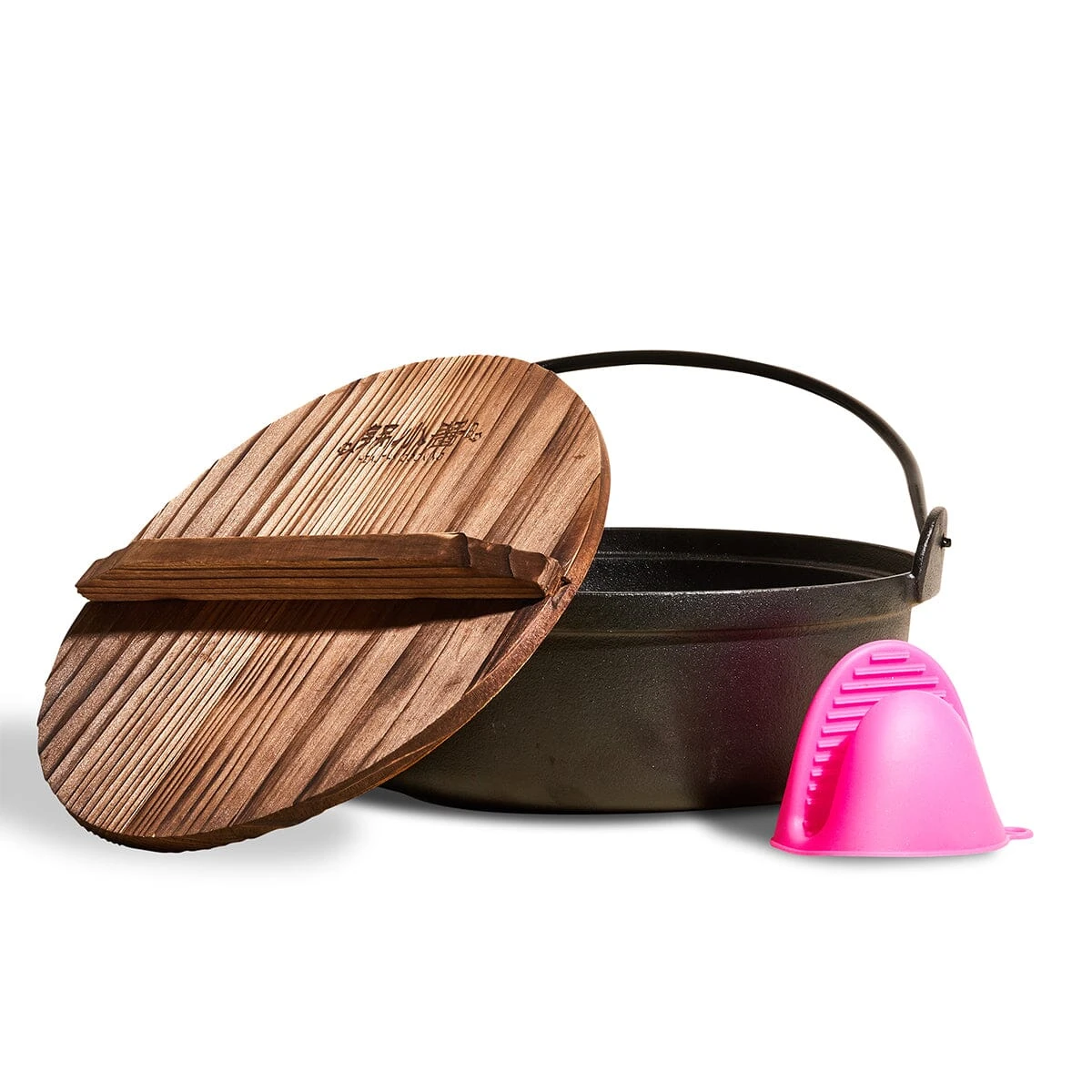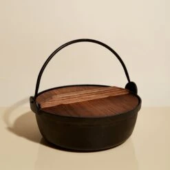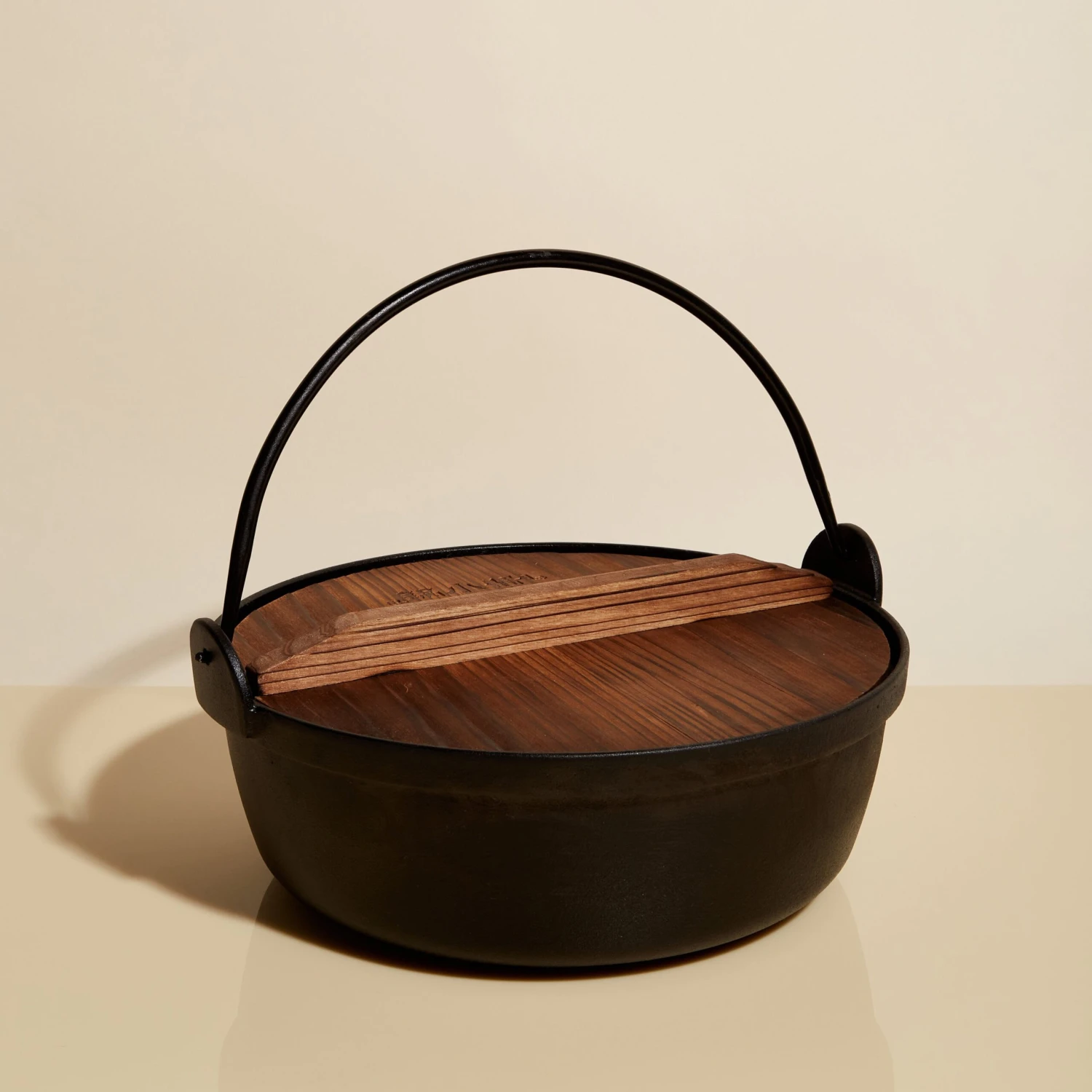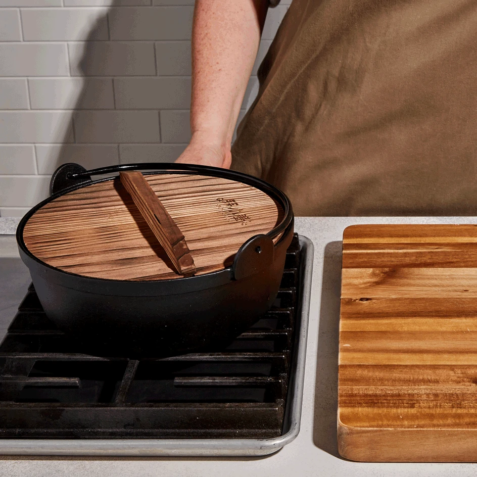 Care: Wood lid not oven-safe. Not dishwasher safe. To avoid rusting, wipe dry immediately after cleaning. [/accordions-break]Traditionally used for nabe, communal hot pot-style meals in Japan. [/banner_heading]Noodles, meat, seafood and vegetables are added to a simmering seasoned broth in a pot next toโor built intoโthe table and left to cook, like fondue but with broth. [/banner-text-break]Use to make soups and stews. We especially like using it to make our Miso Soup with Shiitake Mushrooms and Poached Eggs, Tofu and Kimchi Soup or Udon Noodles in Soy Broth. [/how-to-use-break]Safe for use on gas and induction cooktops, the grill or any open flame. Season before use. Not dishwasher safe. To avoid rusting, wipe dry immediately after cleaning.