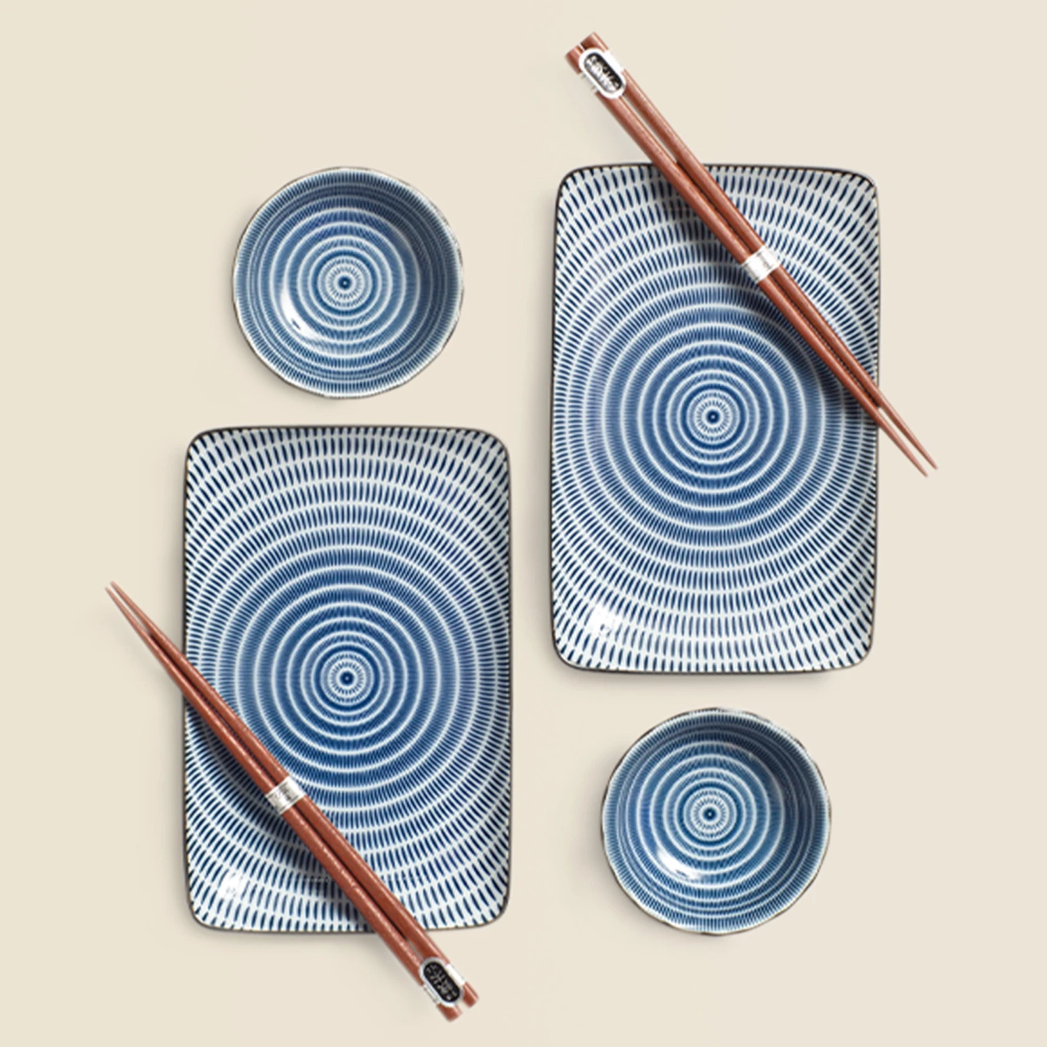 Your takeout has never looked so good. Made in Japan, this sushi set built for two includes two sets of wooden chopsticks, two large rectangular plates and two small bowls for soy sauce—all stunningly packaged in a gift box. The unique navy and white swirled design gives a modern twist to classic Japanese blue and white pottery.
