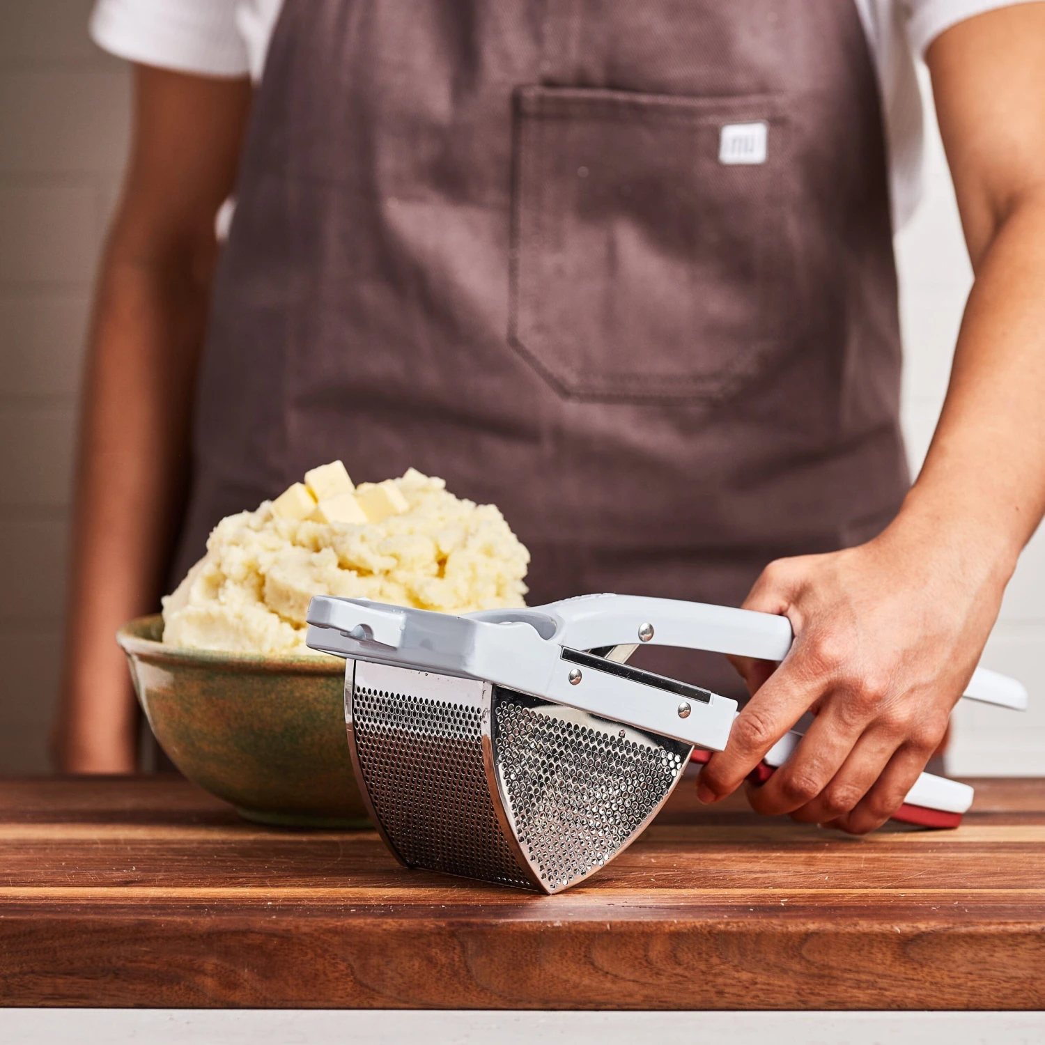 Riced potatoes are the secret to perfect mashed potatoes, homemade gnocchi, spaetzle and other dishes, but ricing potatoes is usually slow and arduous—not so with the Norpro. The first thing we noticed? The size. This stainless steel hopper can hold up to 24 ounces of potato—that’s well over a pound in a single fill—saving time and effort compared to smaller models (and you can still easily press a single potato, if that’s all you need). It’s perforated on all four sides for effortless pressing, which also means the potato doesn’t get compacted while being pressed, making for fluffier rice than other models. Don’t be intimidated by processing so many potatoes at once; the ricer is finished with thoughtful details like extra-long cast aluminum handles for extra leverage, and a silicone-lined notch on the underside so you can add potatoes straight into a bowl or pot. Plus, silicone lining on the underside of the handle and notch protect your bowl and hands while pressing. And the ricer comes apart for easy cleaning, another bonus compared to other versions we’ve tried.