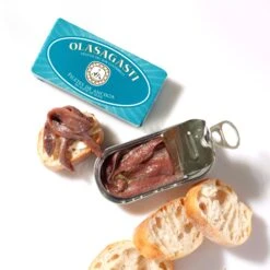 Place of Origin: Spain[/accordions-break]Before adding aromatics and silky, rich olive oil, Olasagasti’s products begin with fresh fish caught from the cold Cantabrian Sea.[/banner_heading]The water is often dotted with local fishing fleets, where arrantzales (Basque fishermen) use traditional methods to procure the day’s catch. And it’s on the shores of the sea that the Olasagasti team selects the seafood to be used in their tinned fish. It’s then transported to their nearby facility, where each fish is cleaned, cooked and packed using time-honored techniques.[/banner-text-break]We love these meaty, salty fish fillets atop a cheese board featuring nutty aged or slightly funky washed rind cheeses, or even soft and creamy cheeses like a goat cheese of ricotta (which balance the brine well). Use as you would any anchovy: Drape over pizza and salads, or blend into a classic Caesar dressing. Incorporate into pasta dishes like Melissa Clark’s Pasta with Anchovies, Garlic and Pepper Flakes, or robust sides like our Skillet-Charred Brussels sprouts with Garlic, Anchovy and Chili. [/how-to-use-break]Tip: Warming your tinned fish before eating wakes up some of the flavors. Simply remove the outer packaging and open the can a small crack (to allow for building pressure to escape) and put them, tin and all, in a low oven to heat. And the brand suggests that you keep the fillets refrigerated for the best quality, but it’s not necessary for food safety! So don’t worry if you only have room in your pantry and not the fridge.