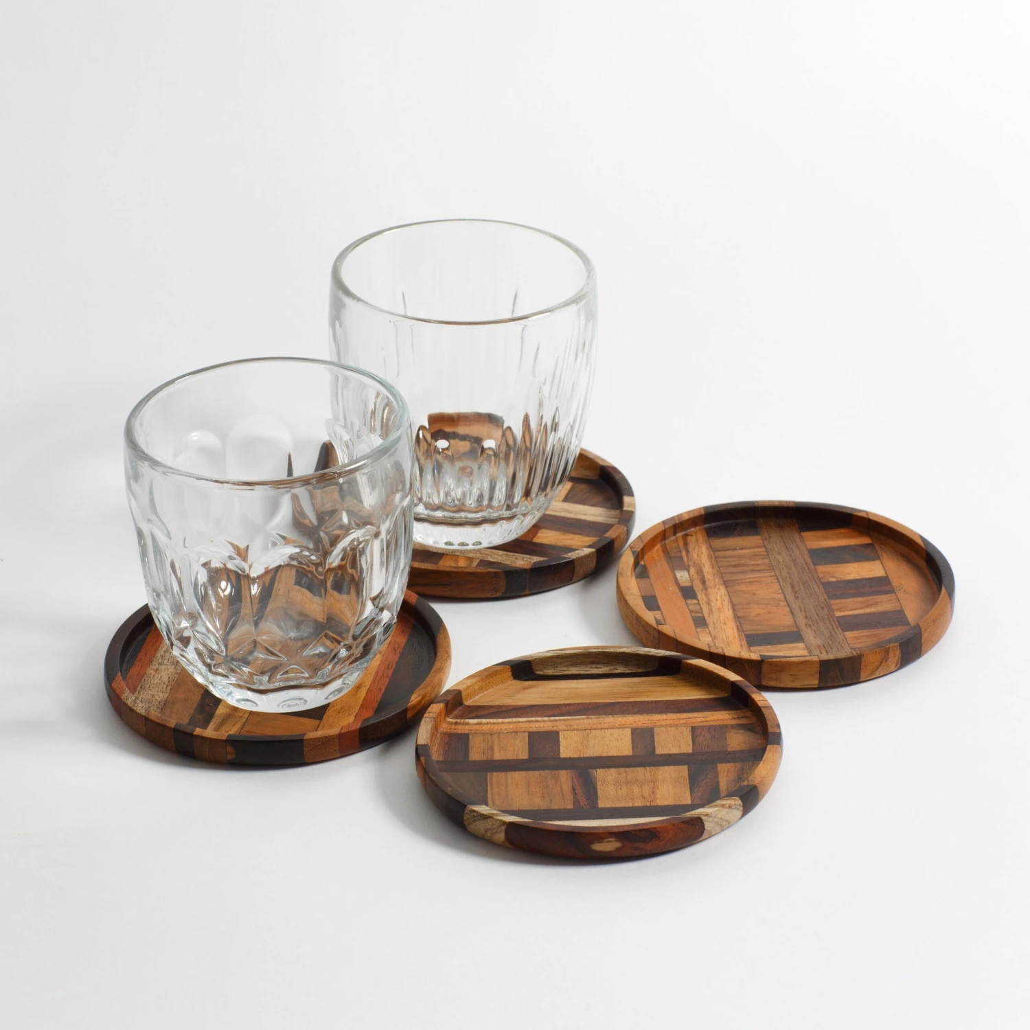 Place of Origin: Indonesia[/accordions-break] Sustainable materials meet elegant design. [/banner_heading] Rather than send refuse materials to the landfill, Indonesian company Paguro rescues excess or used items—like bicycle chains, oak barrels and printer belts—and transforms them into durable, eye-catching housewares. [/banner-text-break] [/how-to-use-break]No two coasters are exactly the same: Each piece may include slight variations in color, size and pattern, as a result of how upcycled wood is sourced by Paguro’s artisans.
