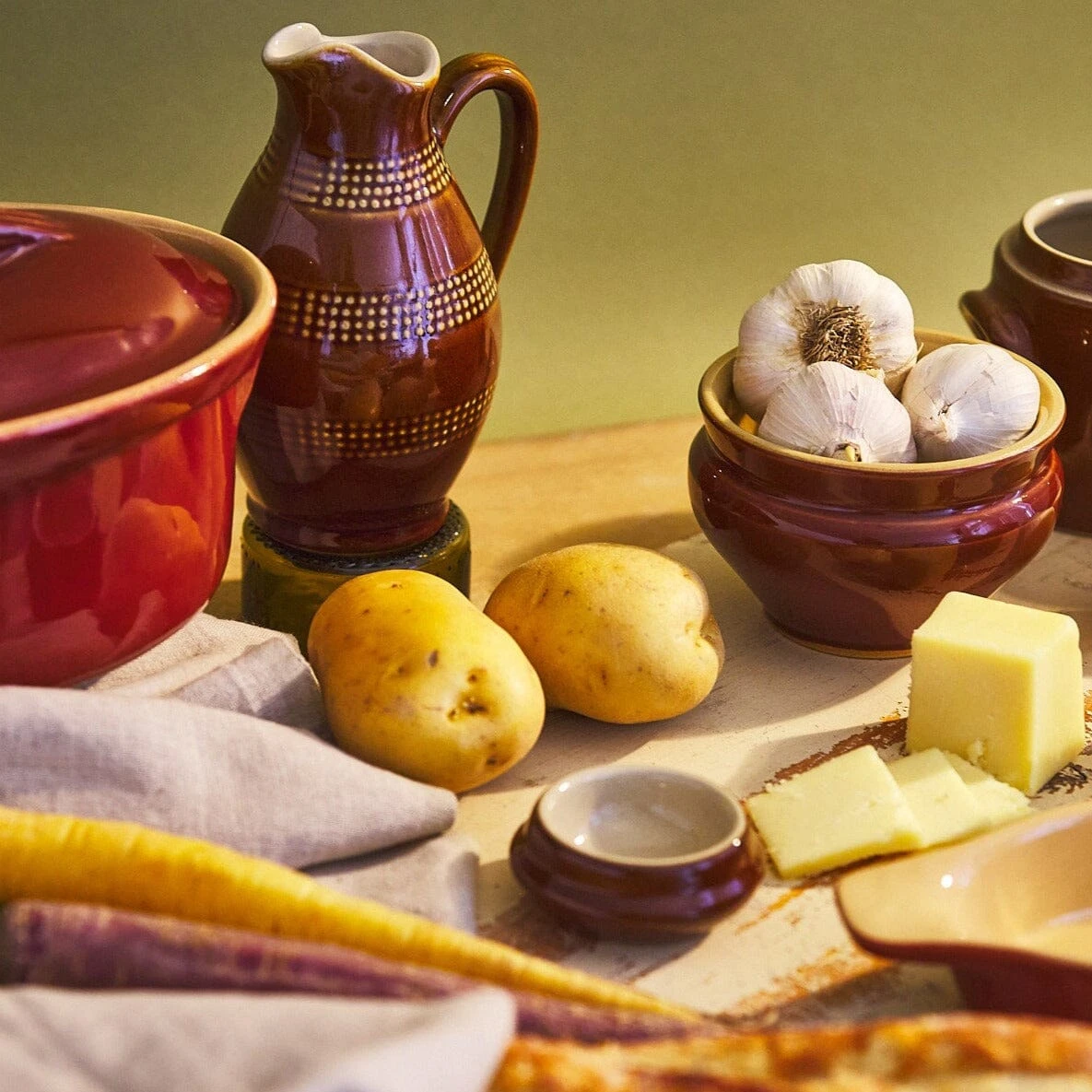 Care: Hand-wash recommended.[/accordions-break] An iconic finish. [/banner_heading] At its height, potters at the factory would craft between 80 to 120 pieces a day, firing them in a blazing 1200 degree kiln with an unexpected additional component: salt. The old technique, known as salt-glazing, rendered pieces with an iconic glassy finish that set them apart. [/banner-text-break] [/how-to-use-break]Oven-safe. Hand-wash recommended.