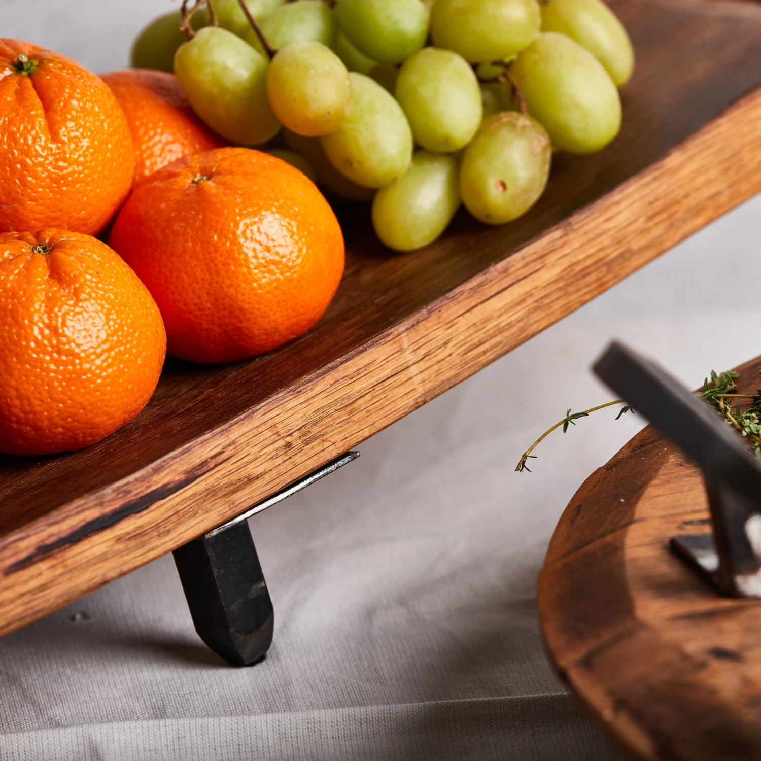 Meet your next heirloom piece. Provence Platters reclaims retired wine barrels from vineyards in the countryside of Napa or Bordeaux and turns each one into stunningly beautiful serving pieces, like this eye-catching bowl. Like great wine, every piece from Provence Platter takes time and skill to perfect. Each platter takes four or five years to make, from drying out retired wine barrels all the way to using woodworking techniques, like elegant Swiss biscuit joinery, which strengthens the assembled pieces and prevents warping or cracking, seamlessly, without any extra hardware. The surface of this rectangular bowl is completely food-safe, thanks to three coatings of beeswax on the oak wood. And each bowl is buffed to a soft luster and finished with iron feet, forged by hand in Brooklyn the old-fashioned way: by heating and hand-bending each piece. Use this sculptural bowl to store fruit or simply leave it on display in your kitchen or dining room.