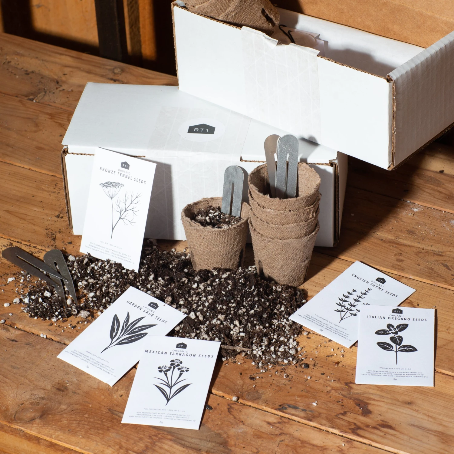 [/description-break] Specifications [/title] Dimensions: 2″ Round Peat PotsMaterials: Biodegradable peat pots, indoor potting mix (organic soil, coconut coir, perlite and bio-char charcoal), wax pencil, plant tags (reusable stainless steel), Italian oregano, garden sage, Mexican tarragon, English thyme, bronze fennel [/accordion] Care and Use [/title] Use: Plant seeds in potting soil and pot according to directions on each seed pack and add water. Click the link to learn more: https://youtu.be/Xc-C38lT3f0 [/accordions-break]Plant seeds in potting soil and pot according to directions on each seed pack and add water. Click the link to learn more: https://youtu.be/Xc-C38lT3f0 [/how-to-use-break]