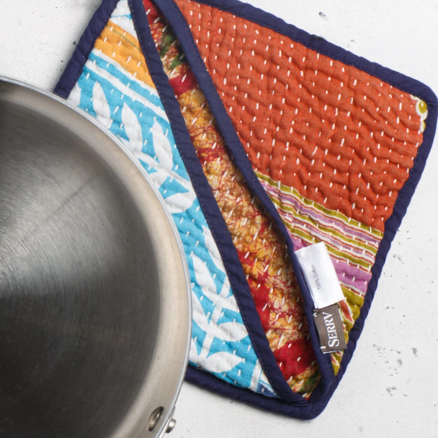 This beautiful hand-stitched pot holder featuring traditional Indian kantha stitching on an upcycled vintage cotton sari is a completely unique kitchen accessory. The needlework is based on an ancient art craft that gave new life to old cloth by upcycling and repurposing various fabrics and textiles. We love their sustainability along with their appealing form and function. The quilted insulation helps protect hands from heat and a hanging loop is attached for easy use and storage. Best of all, they come in a wide array of colors and patterns, with no two alike. These high-quality vibrant pot holders are unlikely to fade with use, as they’ve already been pre-washed to ensure their rich colors stay true. Please note, all of our kantha items are one-of-a-kind, thus the item recevied may not match the image shown.