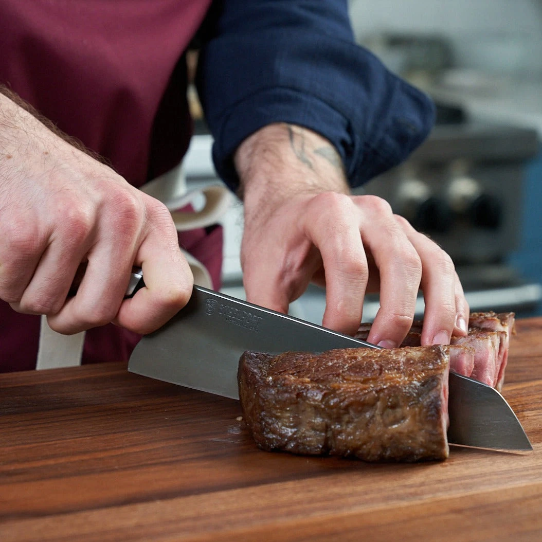 Made in downtown Portland by a small team, Steelport knives are heirloom quality, handmade from classic materials with modern methods for an elegant aesthetic that synthesizes elements of Japanese and Western design. Forged from 52100 carbon steel, a tried-and-true steel produced for more than 100 years ago, the 8-inch knife features a blade that’s tall at the spine—a full 2 inches—and tapers gently. It also has a Japanese-style kiritsuke-tip, which maintains a fairly consistent blade depth from butt to tip that keeps your fingers safe and is convenient for scooping up chopped foods to transfer to a hot pot or mixing bowl. It stays wickedly sharp thanks to a heat treatment followed by rapid cooling, or cryogenic quenching, that aligns and toughens the blade steel to create an edge with 65 Rockwell hardness, significantly tougher than the 57 to 59 hardness of most kitchen knives. The knives’ integral bolster and full-length tang lend them a pleasant heft. The locally sourced Oregon maple burl handle is fully stabilized with resin, so it’s impervious to moisture (though not the dishwasher!). The ergonomic shape fills the palm but remains neutral enough to shift back for leverage or forward for control in perfect balance. Plus, this knife comes with custom-fit Japanese wooden knife guard, called a saya. Beyond protecting the edges during storage or transport, it’ll absorb and wick away moisture, preventing potential rust spots.