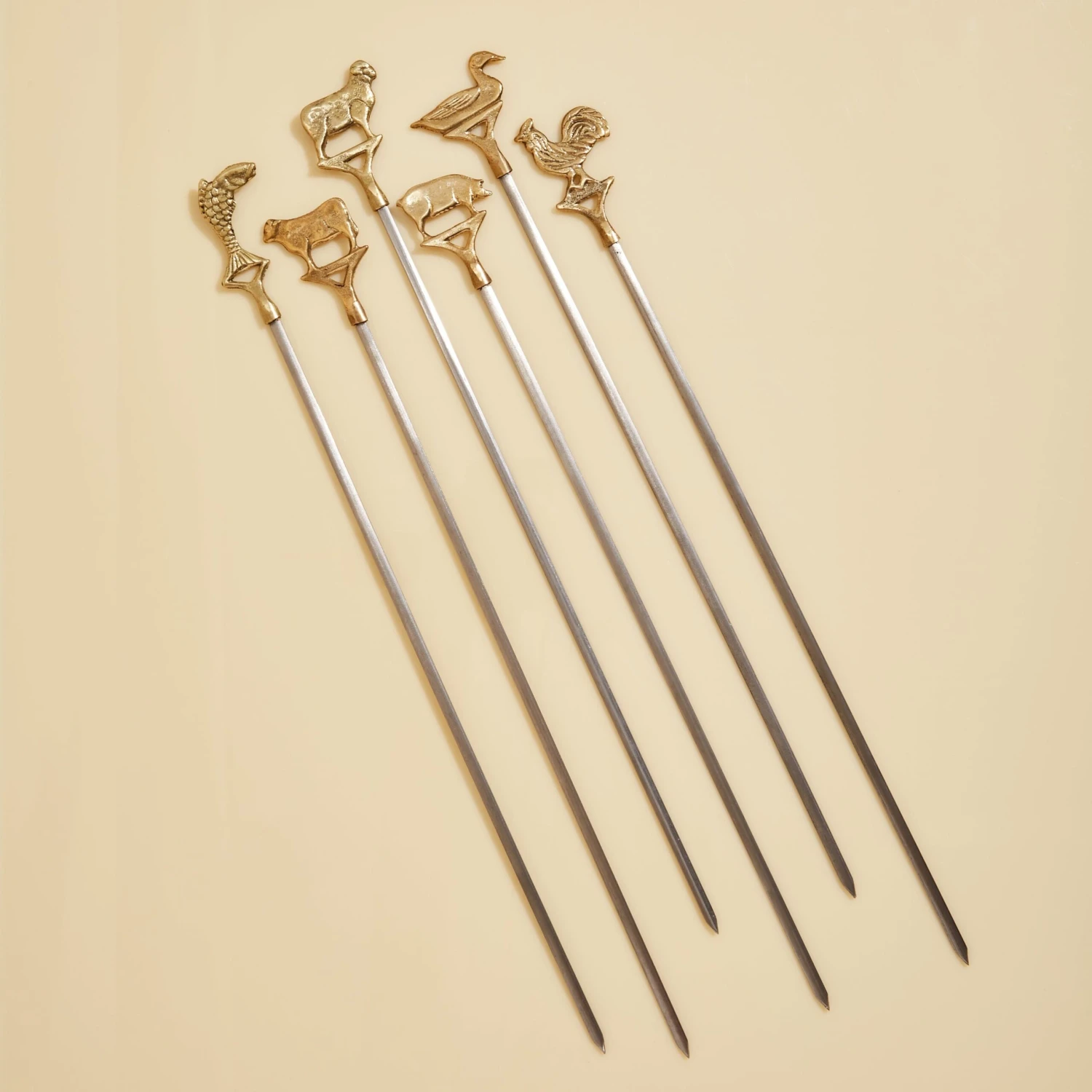 Crafted in Turkey, these classic kebab skewers are made from stainless steel and finished with brass handles shaped like adorable farm animals. Used traditionally for kebabs, these skewers work for any chopped meat or vegetable. The stainless steel construction makes them safe for grilling (they’ll tolerate high heat), and their flat design keeps food from spinning around every time you flip a skewer on the grill. Each set comes with 6 skewers in the following shapes: cow, sheep, duck, pig, fish and rooster.