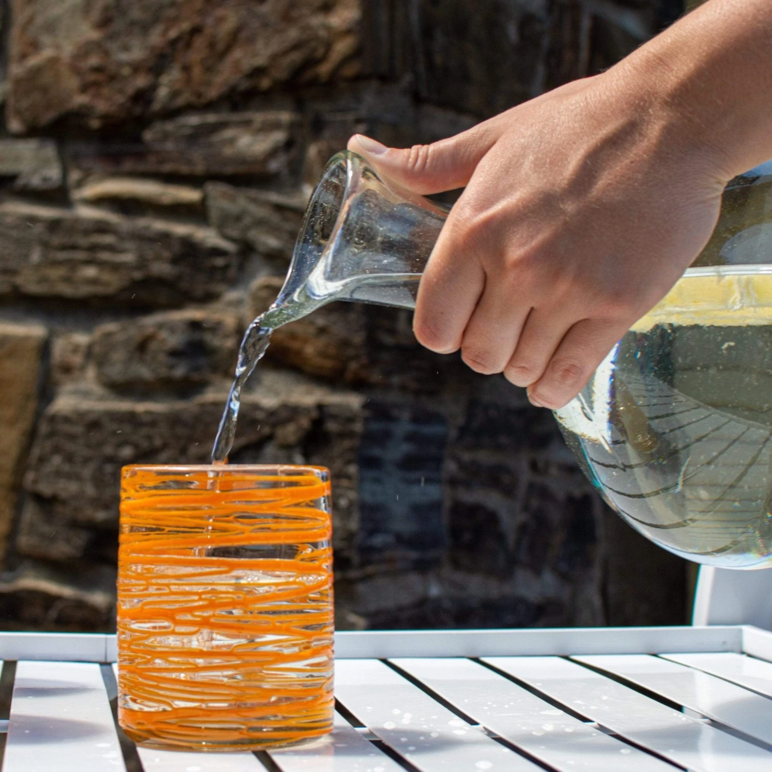 Sustainably made from recycled glass, this handblown carafe is steeped in Mexican tradition. Each is crafted by a team of artisans in Tonala, Mexico, led by Javier Gutierrez Esponsa, who has been mastering the art of glassblowing for decades—beginning when he saved a glass factory from being demolished at age 22. Although each carafe has a slightly different character, as is the case with handmade pieces, all feature a round, balloon-like base that tapers into an elegant slender neck with a tidy spout for easy pouring. Clear with delicate tendrils of orange adoring the neck, this piece is sure to make a statement at the center of your table. Plus, it’s sturdy, yet easy to hold—ideal for serving libations like water, iced tea and batch cocktails in style.[/description-break]