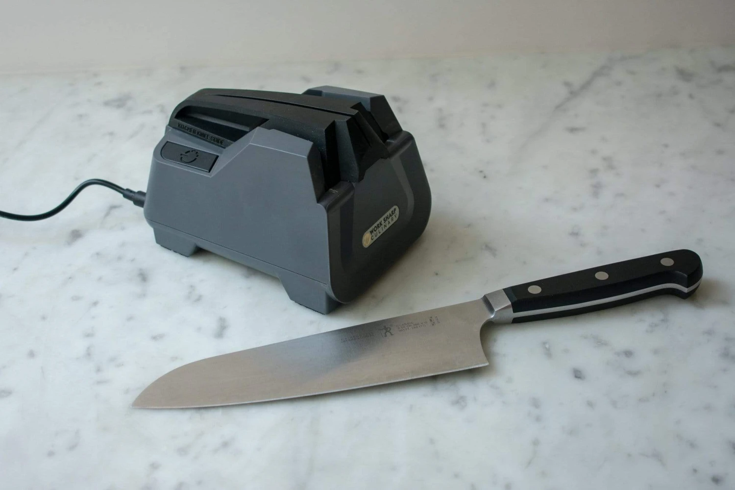 Dimensions: 8.7 x 5.4 x 4.5 inches[/accordion] CARE AND USE [/title] Wipe clean.[/accordions-break]If you camp, craft or garden and have an array of cutlery to sharpen, we also offer an upgraded version of the E2.[/banner_heading] This has a second speed, stronger motor and knife guide for sharpening anything from pocket knives to cleavers—you won’t find a more useful investment in your kitchen. Upgraded model features additional guide for pocket knives, two speeds, and upgraded motor for thicker blades.[/banner-text-break]